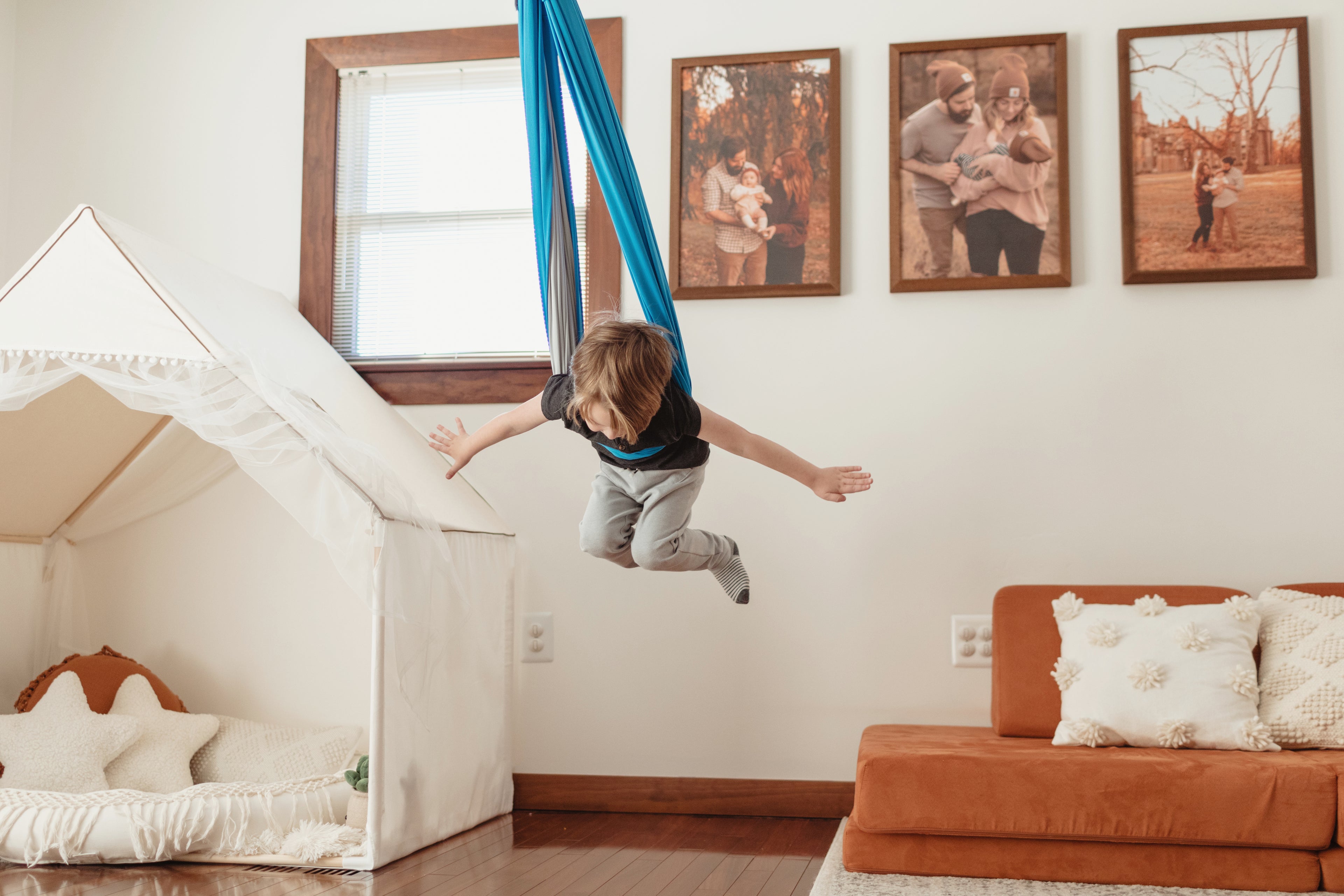 The swing provides gentle compression and vestibular input, which helps children with sensory processing issues relax and improve focus.